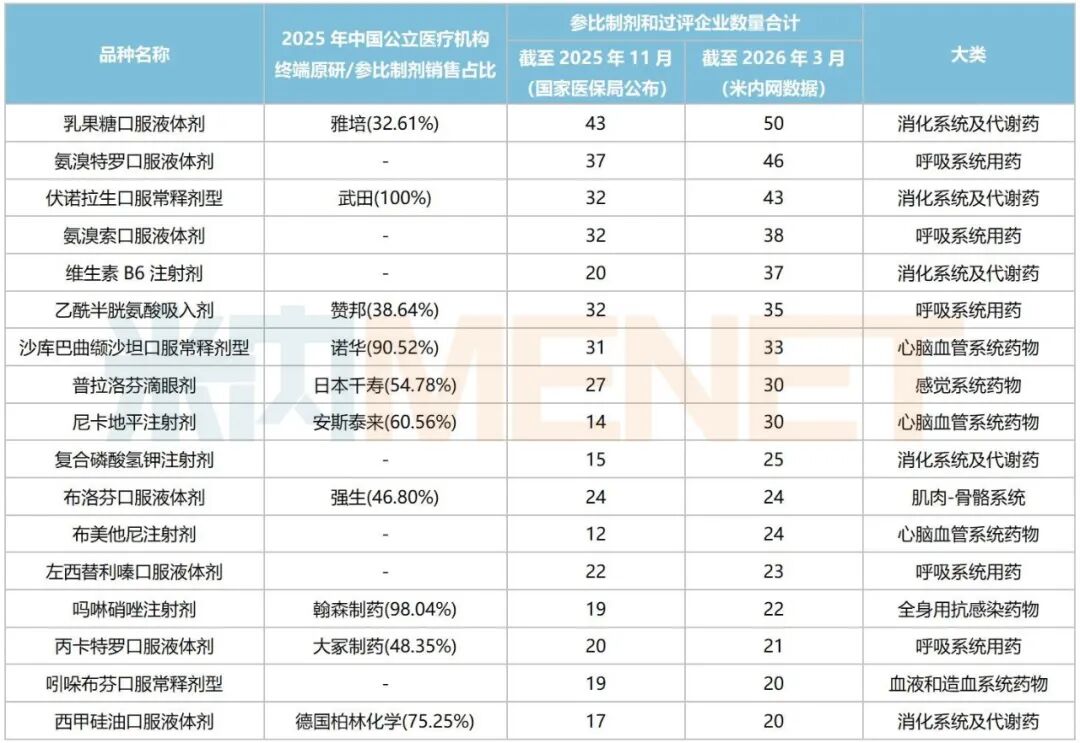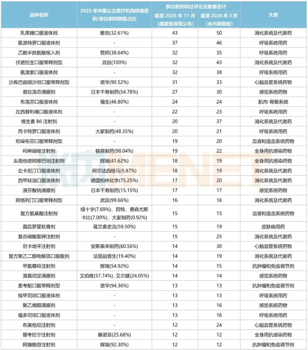 若以截至2026年3月的时间点统计,151个品种中,参比制剂和过评企业数量合计超过20家的品种有17个,超10家但不足20家的品种有55个,7-9家的品种有37个,5-6家的品种有42个。