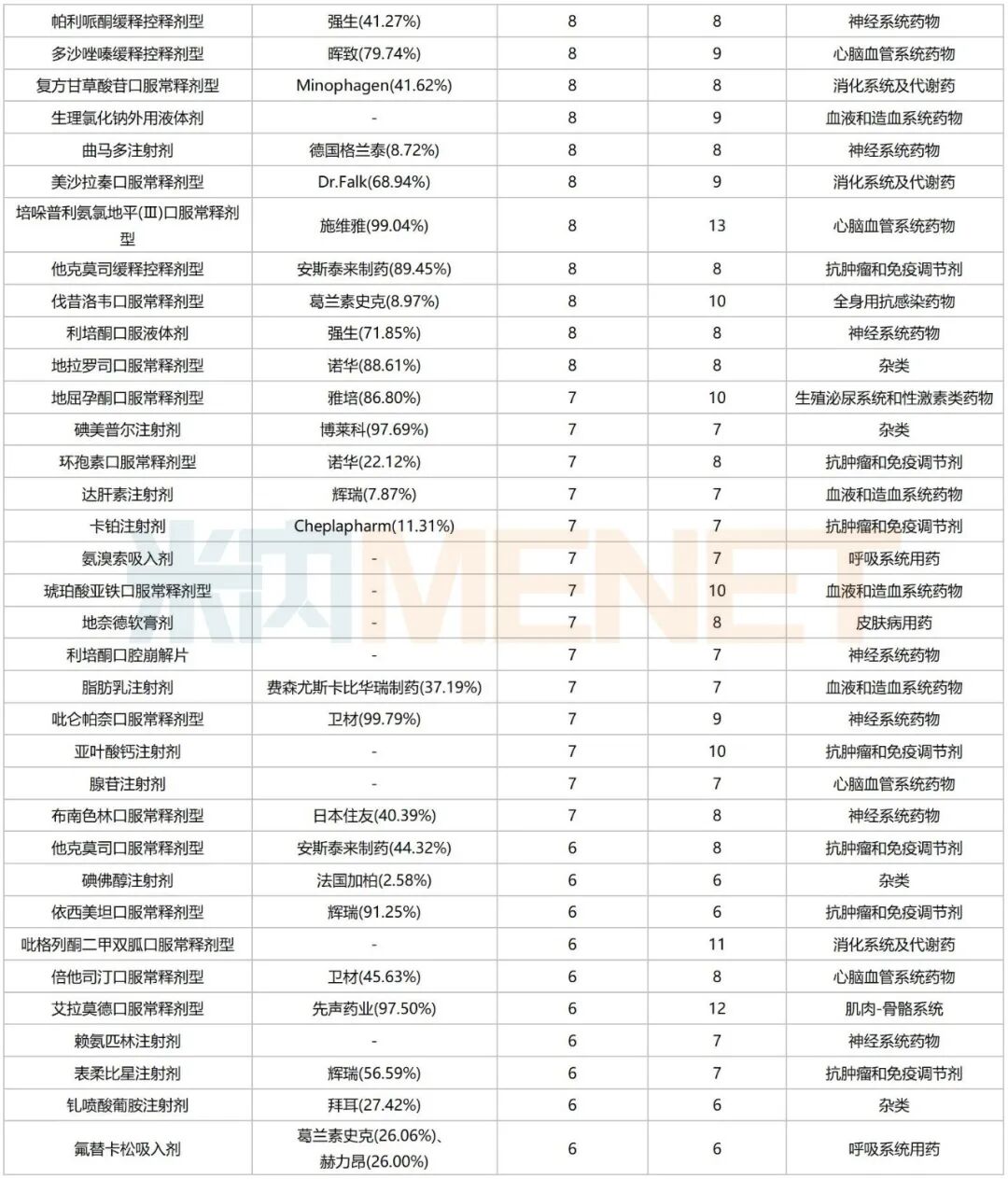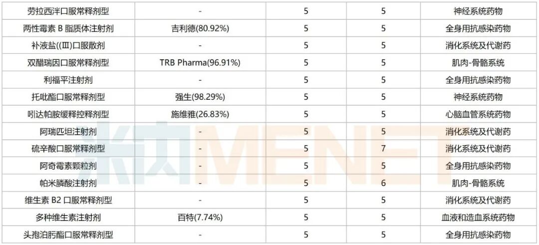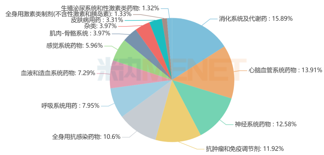 从治疗领域看,151个品种涵盖13个治疗大类,集中在消化系统及代谢药、心脑血管系统药物、神经系统药物、抗肿瘤和免疫调节剂、全身用抗感染药物等,涉及的品种数分别达24个、21个、19个、18个、16个,占比均超过10%。