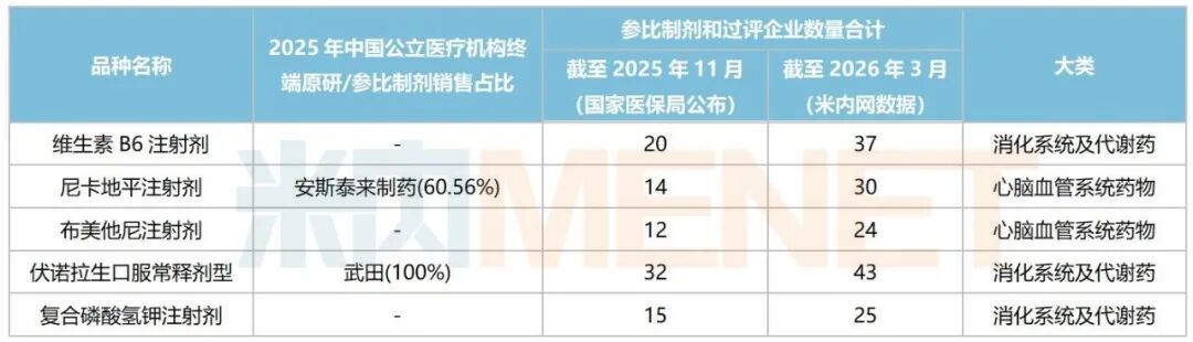 从截至2025年11月(国家医保局公布)与截至2026年3月(米内网数据库)两个时间节点的企业数量看,151个品种中,有超过一半的品种新增了过评企业。其中,维生素B6注射剂、尼卡地平注射剂、伏诺拉生口服常释剂型、布美他尼注射剂、复合磷酸氢钾注射剂等品种新增过评企业数均达10家及以上。