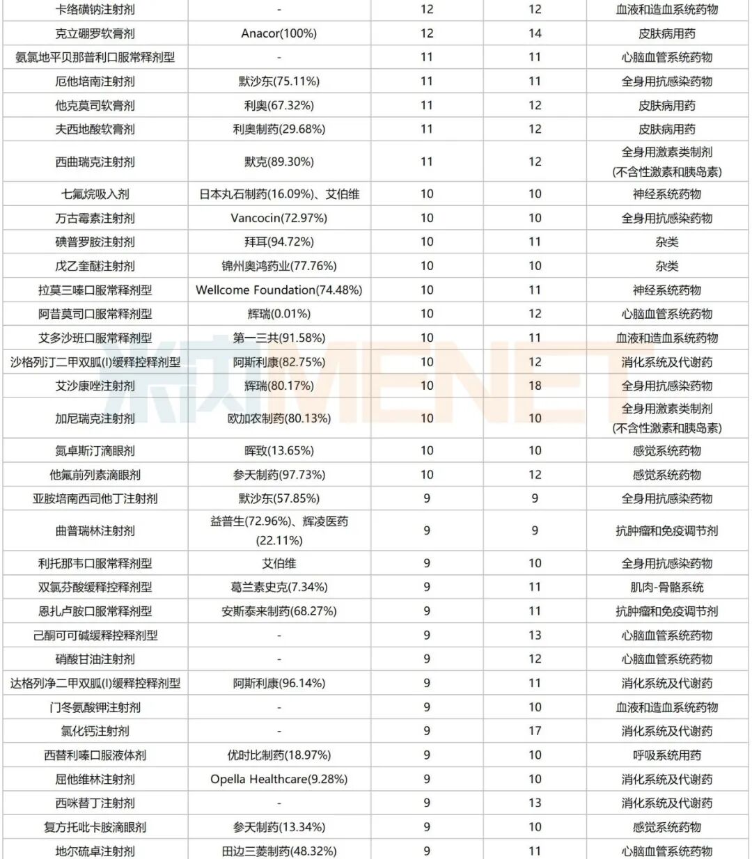 来源:米内网中国公立医疗机构药品终端竞争格局