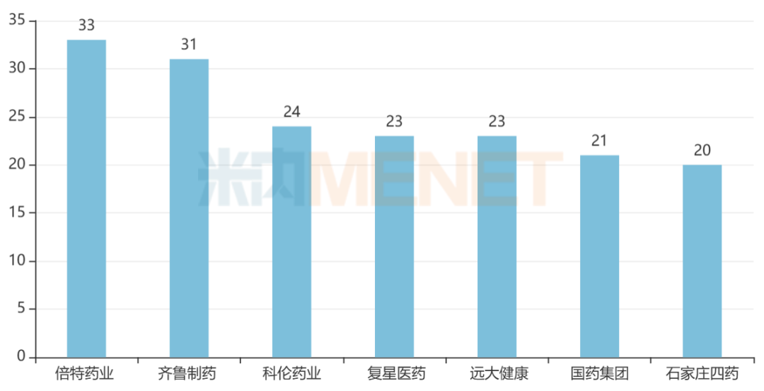 从151个品种的过评企业看,倍特药业、齐鲁制药、科伦药业、复星医药、远大健康、国药集团、石四药为“主力军”,目前过评品种数分别有33个、31个、24个、23个、23个、21个、20个。