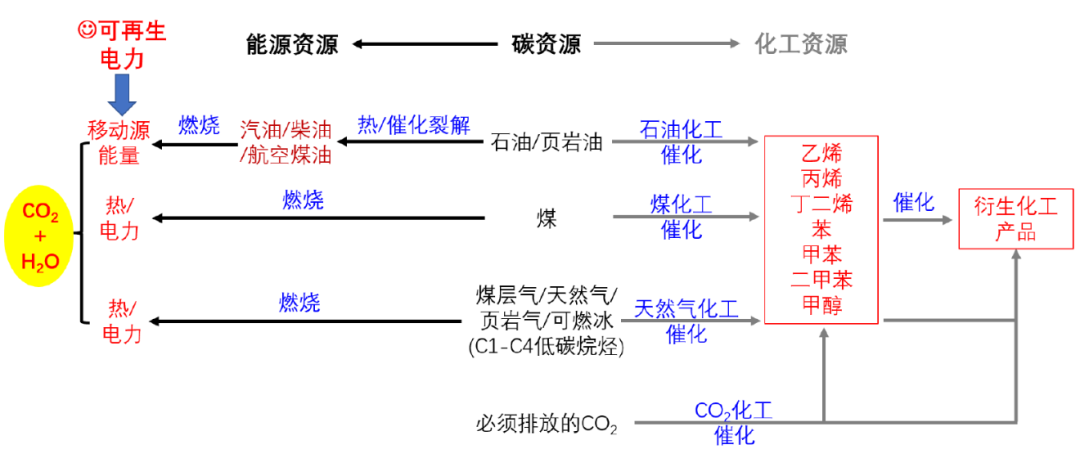 石油、煤、天然气等作为碳资源通过燃烧过程提供热能和通过化工过程提供各种基础化学品(图3), 结合化石燃料水蒸气重整过程制氢和哈伯法过程合成氨等, 形成了较完备的基础能源和化工体系来支撑社会发展. 催化科学与技术在基础能源和化工体系中起着关键作用, 同时获得快速发展. 多相催化基础研究主要围绕上述基础能源和化工体系中的关键热催化反应和过程展开. 但是, 碳资源燃烧提供热能过程产生大量CO2, 同时化石燃料水蒸气重整制氢过程也产生大量CO2. 这些CO2排放到大气中产生的温室气体效应对社会可持续发展带来了严峻的威胁. 有鉴于此, 2015年12月12日, 在巴黎举行的《联合国气候变化框架公约》第二十一次缔约方会议上, 196个缔约方通过了具有法律约束力的气候变化国际条约《巴黎协定》, 目标是将全球气温升幅控制在工业化前水平以上低于2 ºC最好是1.5 ºC之内, 并于2016年11月4日生效.