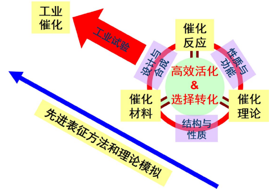 如图1所示, 催化研究的核心是反应物分子的高效活化和选择转化, 传统上可分为工业催化研究、催化反应研究、催化材料研究和催化理论(基础) (以下统一为催化基础)研究. 此外, 由于催化研究的复杂性, 针对催化过程开发的先进表征方法和理论模拟方法也是催化研究的内容之一. 在此, 我们强调的是, 催化基础研究同时包括催化作用原理的理论模拟研究和实验研究, 并且, 由于催化的复杂性和重大应用背景, 以实验研究为主的催化基础研究在当下对工业催化更具有指导意义.