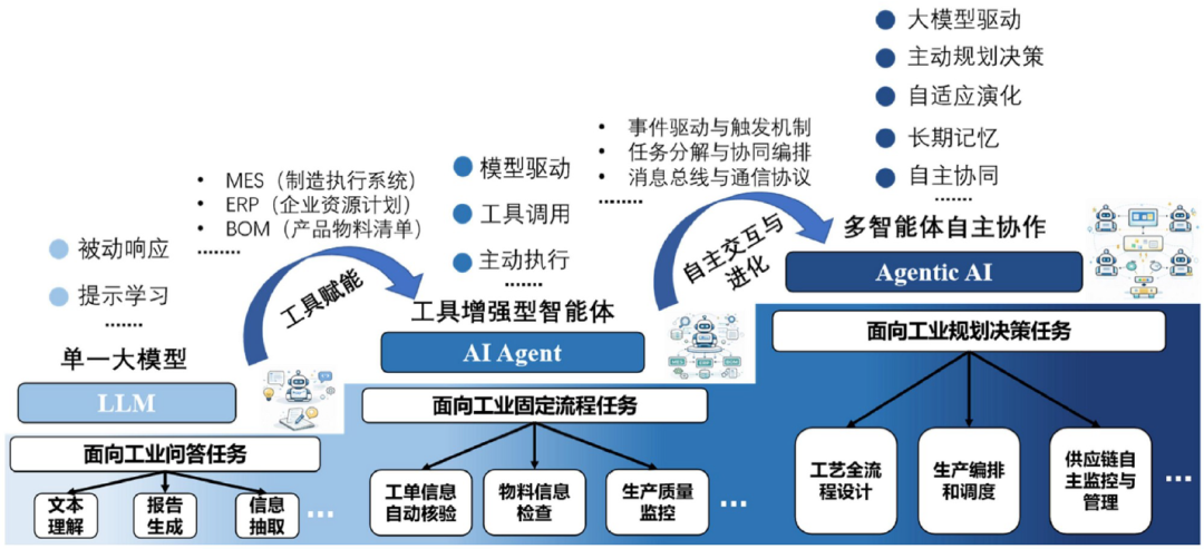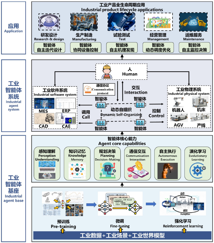 随着工业大模型、具身智能等新一代人工智能技术的发展,催生了面向Agentic AI的新一代智能体,也为工业人工智能的发展提供了新的契机。工业智能体作为新一代人工智能技术驱动的、服务于工业产品全生命周期应用的新型智能体系统,包括具身智能体和非具身(软件系统)形态,具备面向工业场景的感知理解、知识记忆、规划决策、通信交互、自主执行、演化学习等核心能力,能够为工业制造业研发设计、生产制造、试验测试、经营管理、运维服务等全业务链条提供智能化服务。当前针对新一代工业智能体的系统化研究仍属空白。本文为新一代人工智能驱动的工业智能体理论与技术体系的构建、系统的研制以及产业应用的发展,提供了一种体系化的参考。本文给出了工业智能体的定义,分析了其关键特征;提出了工业智能体的体系架构,包括工业智能体基座、工业智能体系统以及工业应用三个层次,阐述了工业智能体的关键技术;围绕工业产品全生命周期活动,讨论了研发设计类智能体、生产制造类智能体、试验测试类智能体、经营管理类智能体、运维服务类智能体的未来典型应用场景;最后展望了工业智能体的未来发展,分析了工业智能体基座、工业世界模型、软硬协同的工业智能体、具备长期记忆的可信智能体、工业智能体内生安全、标准化等未来技术方向。工业智能体作为新一代人工智能技术驱动的、服务于工业产品全生命周期应用的新型智能体系统,包括具身智能体和非具身(软件系统)形态,具备面向工业场景的感知理解、知识记忆、规划决策、通信交互、自主执行、演化学习等核心能力。其关键特征包括:(1)从规则驱动到大模型驱动;(2)从被动响应到主动规划决策;(3)从离线学习到自适应演化;(4)从短期记忆到长期记忆;(5)从单体智能到多智能体自主协同。工业智能体是由工业大模型驱动的自主智能系统,是具备自主感知,认知,规划,决策,演化与行动执行能力的工业智能系统。它能够在复杂工业场景中完成感知-认知-行动闭环,实现人-机-环境的高效协同与智能演化,同时能实现智能体间的高效协同与动态组织。工业智能体体系架构如下图所示,包含工业智能体基座,工业智能体系统以及工业应用三个层次。 面向工业产品全生命周期实际需求,传统工业智能体多以“单步任务辅助”为主要能力,缺乏对跨环节知识的理解,无法持续跟踪上下文并执行长链条任务。而工业智能体通过自主规划,自主调用工具,跨模态理解,长期记忆等能力,能够自主决策并执行工业任务,主要应用如下图所示。