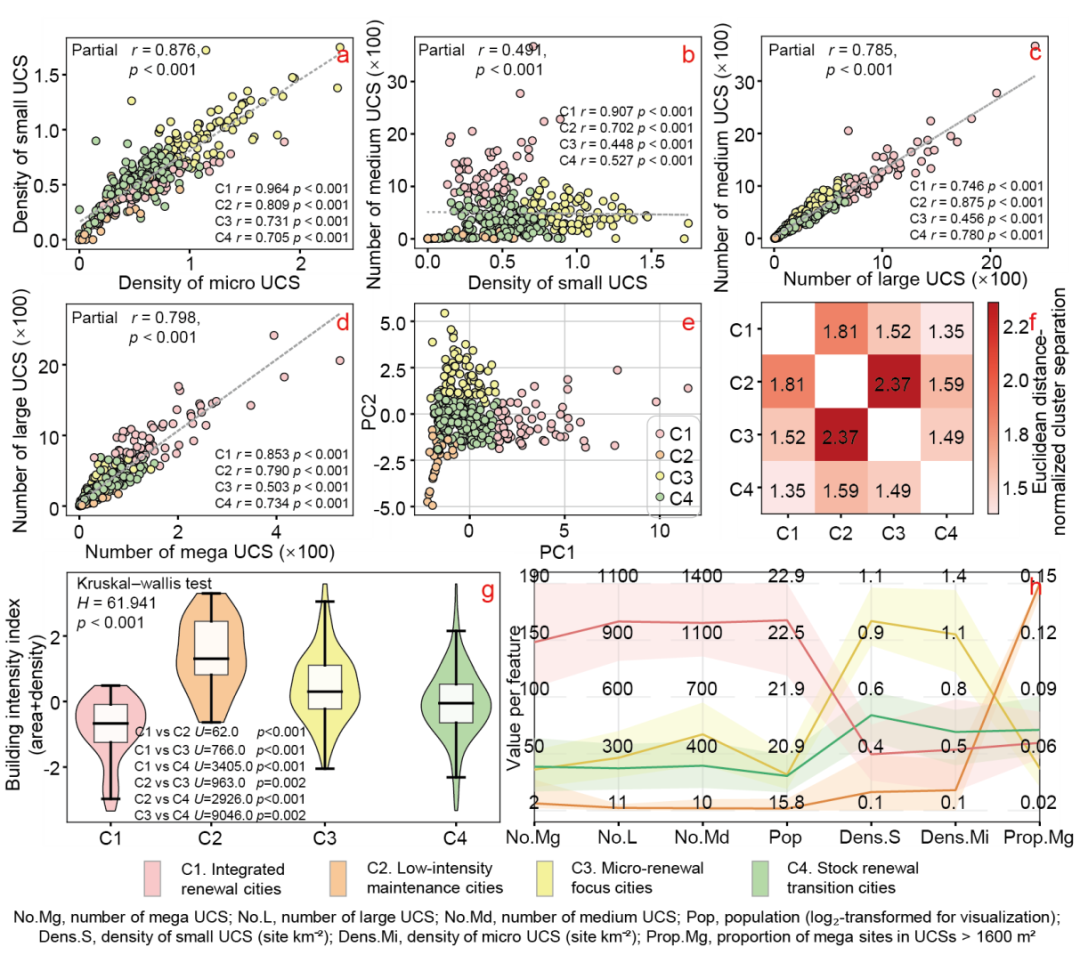 图4. 城市建筑工地(UCS)规模的多尺度协同与分异。a–d 显示在控制城市面积后,不同规模UCS之间的两两关系,其中 p 值在每个检验族(完整样本或聚类子集各包含4个检验)内采用 Holm 方法进行校正。a,微型UCS密度与小型UCS密度;b,小型UCS密度与中型UCS数量;c,中型UCS数量与大型UCS数量;d,大型UCS数量与超大型UCS数量。各图中点的颜色表示城市聚类类型(C1–C4),并在所有子图中保持一致。每个面板中均给出了对应的 Pearson 相关系数和偏相关系数。e,基于UCS指标体系主成分空间的K-means 聚类结果可视化。f,四种城市更新模式之间的聚类分离度。热图展示分离比,其中分子为聚类𝑖与 𝑗之间的平均欧氏距离,分母为两个聚类中较大的簇内平均欧氏距离。数值>1表示两个聚类之间的分离程度超过任一聚类内部的离散程度。g,四种城市更新模式下建筑强度指数的分布。该指数综合了住宅施工面积与住宅施工密度。h,四类城市更新模式的聚类中心特征剖面。