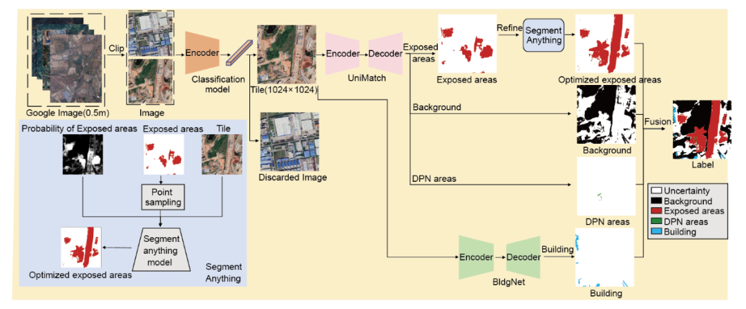 图1. 人机交互与弱/半监督学习的半自动标注框架。蓝色框是使用 Segment Anything 模型优化裸露区域的流程图。“Probability”表示 UniMatch 对裸露区域检测的分类得分,颜色越亮(越接近白色)表示概率越高。图像数据 © Google。