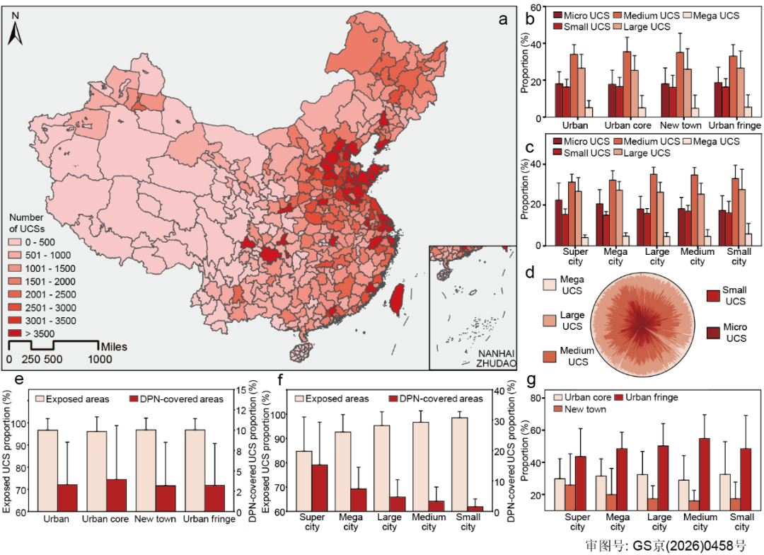图3 全国UCS分布及空间统计特征。a UCS的数量及空间分布。b 不同城市区域中各规模UCS个数比例。c不同人口规模城市中各规模UCS个数比例。依据1990、2000和2020年的城市边界数据,将城市区域划分为三类:(1)城市核心区(1990年边界以内),(2)城市新城(1990-2000年间扩展区域),(3)城市边缘区(2000-2020年间扩展区域)。按照常住人口规模,城市分为小城市(<50万)、中等城市(50万–100万)、大城市(100万–500万)、特大城市(500万–1000万)和超大城市(>1000万)。Micro、Small、Medium、Large、Mega分别表示微型(<400 m²)、小型(400–1,600 m²)、中型(1,600 m²–1 ha)、大型(1–10 ha)和特大型UCS(>10 ha)。d 全国各地级市不同规模的UCS个数比例。圆图被均分为372个扇区,每个扇区代表一个地级市。e 不同城市区域中裸露地表区域与防尘网覆盖区域面积比例。f 不同人口规模城市中裸露地表区域与防尘网覆盖区域面积比例。g 不同人口规模城市中各城市区域UCS个数比例。