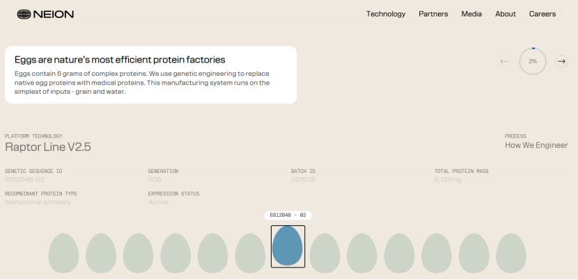Neion Bio的核心技术在于利用鸡蛋作为“生物反应器”来生产重组生物制剂。公司联合创始人兼首席执行官Dimi Kellari指出,传统的生物制造工艺“几十年来未曾改变”,如今已成为开发突破性新药的“主要瓶颈”,也制约着现有重要药物的供应和本土化生产。