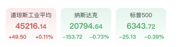 受油价持续走高与科技股大幅下挫拖累,美股周一高开低走。截至收盘,道琼斯工业平均指数上涨49.50 点,涨幅0.11%,收于45216.14 点。纳斯达克综合指数下跌0.73%,收于20794.64 点。标普500指数下跌0.39%,连续第三个交易日收跌,收于6343.72点。