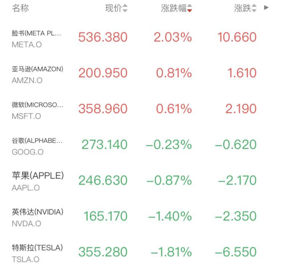 明星科技股涨跌互现,Meta涨2.03%,亚马逊涨0.81%,微软涨0.61%,谷歌跌0.23%,苹果跌0.87%,英伟达、特斯拉跌超1%