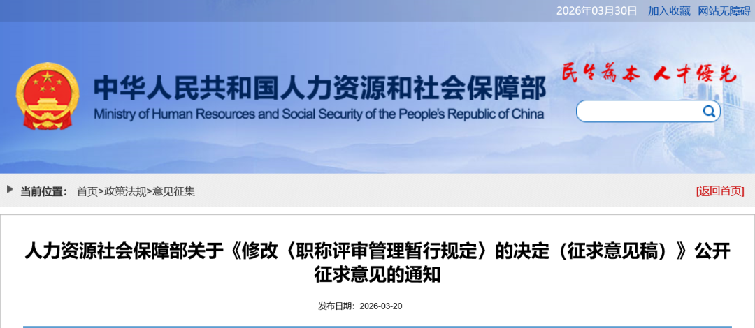 为深入贯彻落实党中央、国务院关于深化人才发展体制机制改革的决策部署,进一步深化职称制度改革,人力资源社会保障部研究起草了《人力资源社会保障部关于修改〈职称评审管理暂行规定〉的决定(征求意见稿)》(下文简称《征求意见稿》),向社会公开征求意见。