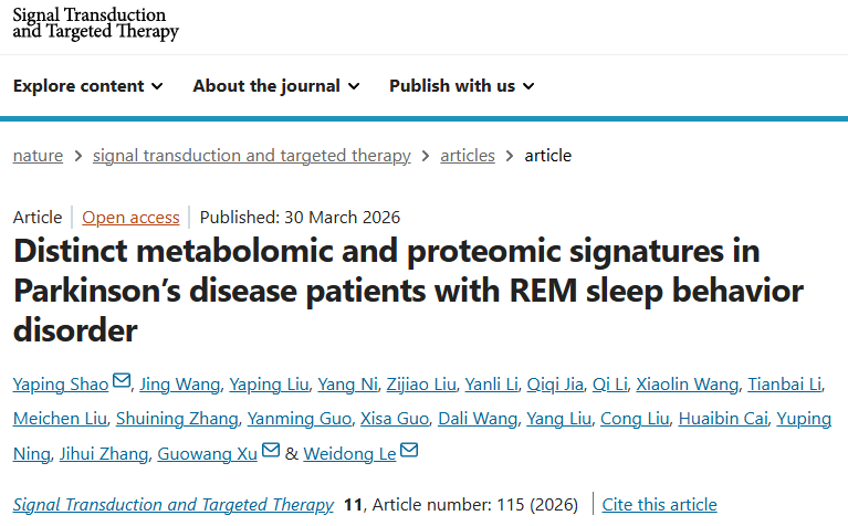 近日,大连医科大学附属第一医院乐卫东/邵亚平、中国科学院大连化学物理研究所许国旺团队一项发表于国际知名期刊《Signal Transduction and Targeted Therapy》的突破性研究,通过整合代谢组学、蛋白质组学与宏基因组学,首次系统描绘了伴快速眼动睡眠行为障碍的帕金森病(RBD-PD)这一临床侵袭性亚型的独特分子图谱。研究揭示了RBD-PD患者血液中显著富集源自肠道菌群的毒性芳香族氨基酸分解代谢产物,并构建了一个包含9种代谢物的诊断模型,可高效区分帕金森病亚型,为理解疾病异质性、早期预警及精准干预提供了全新视角。