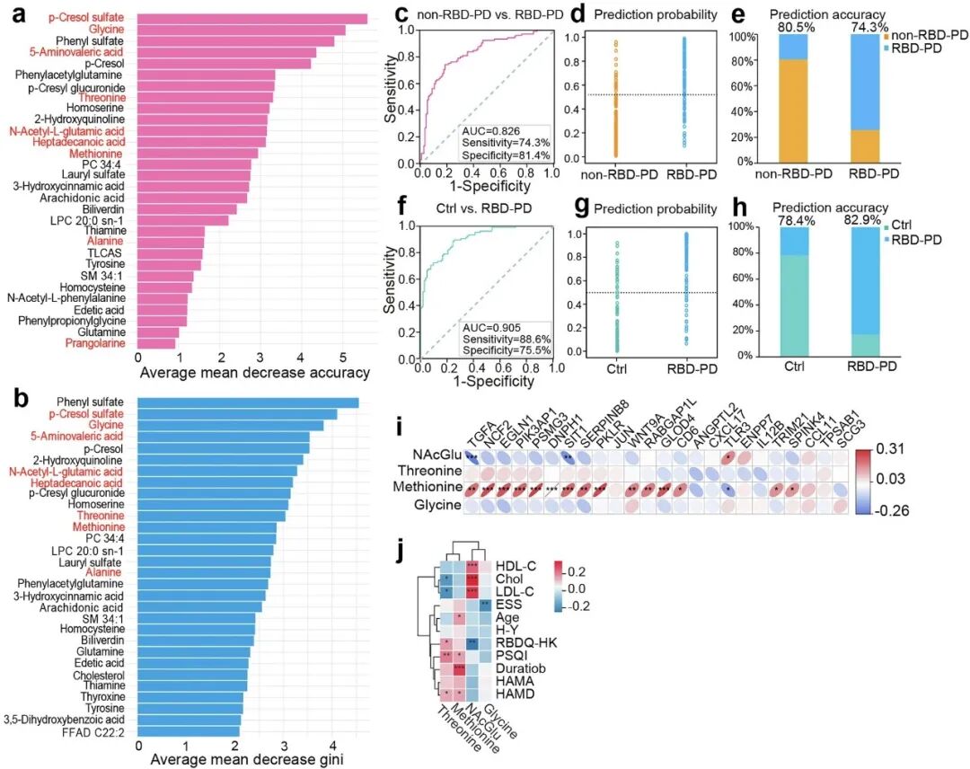 基于上述发现,研究团队构建了一个包含9种代谢物(包括对甲酚硫酸盐、甘氨酸、5-氨基戊酸等)的诊断模型。该模型在区分RBD-PD与不伴RBD的PD患者时,在验证队列中显示出高达0.967的曲线下面积(AUC),灵敏度为90.0%,特异性为100%,预测准确性优异。这为未来实现帕金森病的亚型精准分型提供了强有力的工具。