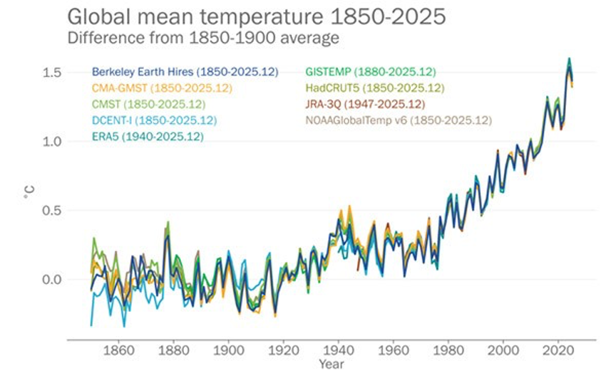 相对于工业化前(1850-1900年)基准的全球年平均气温异常值。来源:World Meteorological Organization
