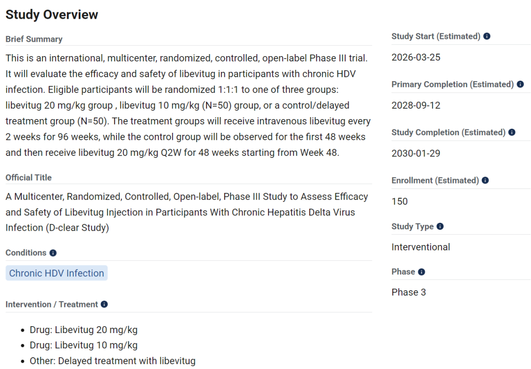 2026年3月30日,华辉安健在Clinicaltrials.gov网站上注册了立贝韦塔单抗治疗慢性丁肝感染的全球三期临床D-clear。