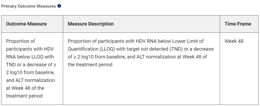 该三期临床主要终点为治疗48周HDV RNA转阴(低于检测限)或降低2个log以上同时ALT恢复正常的比例。