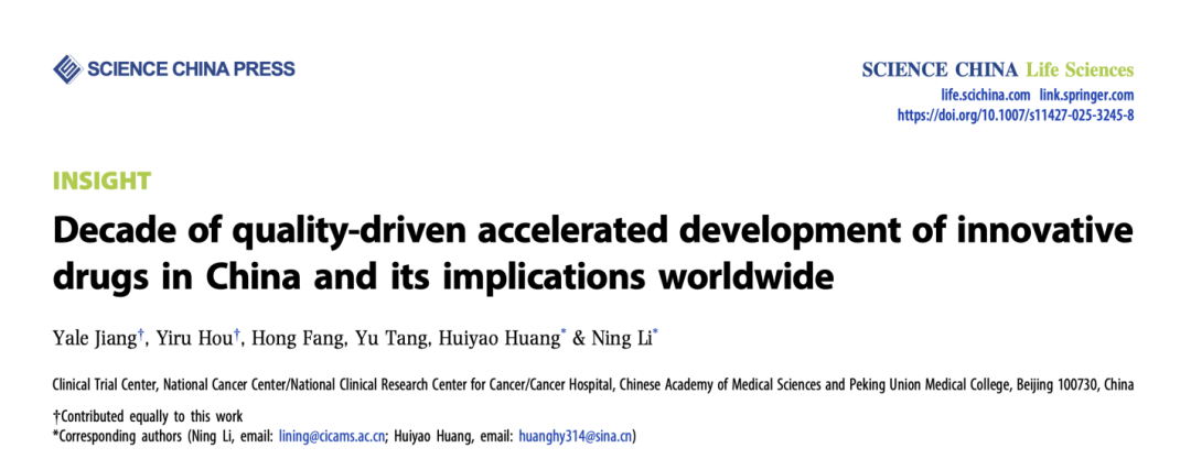 近日,SCIENCE CHINA Life Sciences(《中国科学:生命科学》英文版)在线发表了中国医学科学院肿瘤医院李宁教授与黄慧瑶副教授牵头撰写的题为“Decade of quality-driven accelerated development of innovative drugs in China and its implications worldwide”文章。文章系统回顾了中国创新药在过去十年间从质量变革到生态重塑的跨越式发展,并探讨了这一“中国范式”对全球的启示意义。