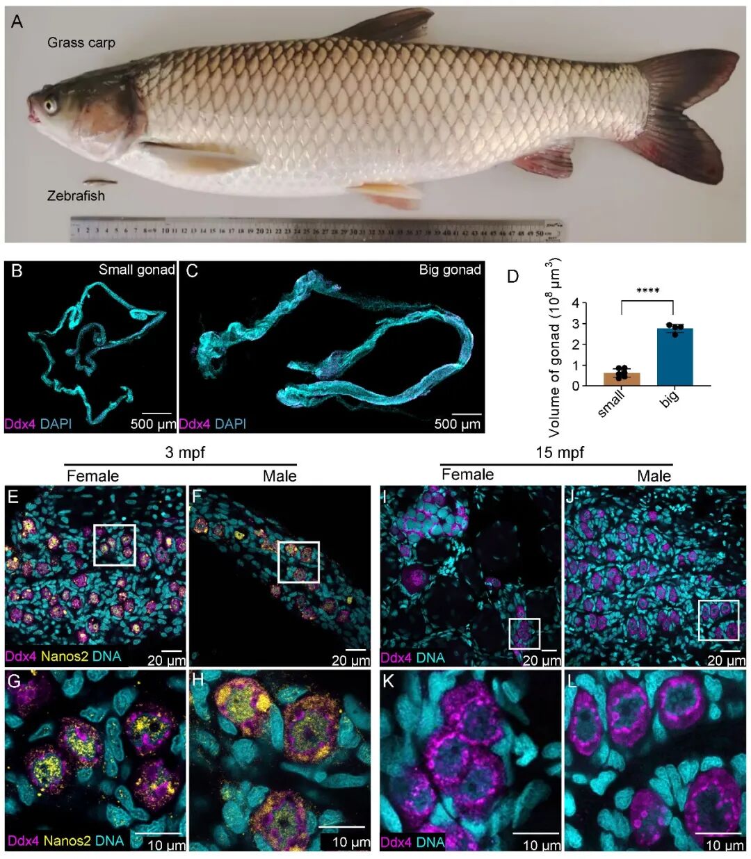 值得一提的是,这项研究首次在养殖鱼类中实现了雌性生殖干细胞的明确鉴定和精细刻画,并证明了其具有发育为精子的潜能。此外,在跨物种借腹生殖体系中,供体草鱼和受体斑马鱼不仅性成熟周期相差约20倍,成体体重更相差近2万倍,这两项跨尺度差异均远远超出了此前同类型研究。