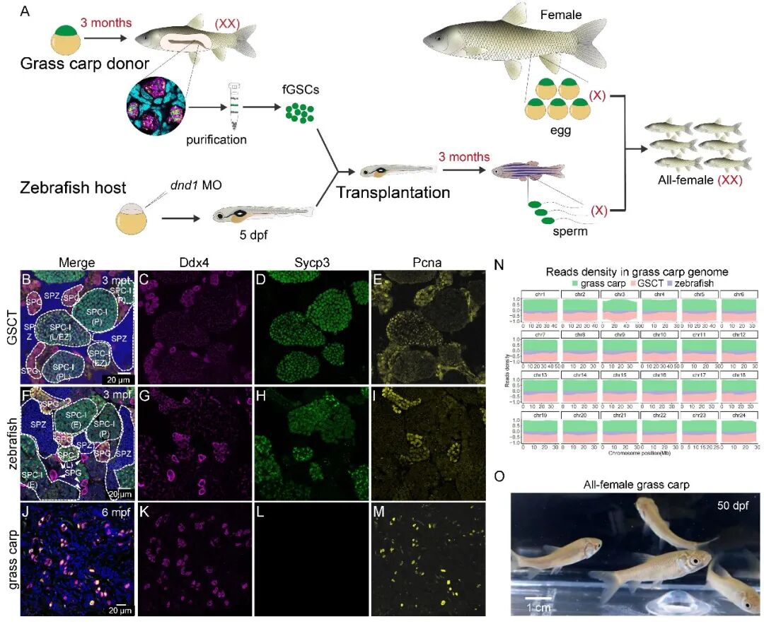 他们进一步分离3月龄的草鱼卵巢,纯化获得雌性生殖干细胞,移植入内源生殖细胞剔除的斑马鱼幼苗生殖嵴。在移植形成的重组性腺中,草鱼生殖细胞在斑马鱼性腺微环境中快速启动精子发生进程,仅需3个月即分化为成熟精子。重要的是,所有的精子均为全X基因型,与普通草鱼卵受精即获得全雌草鱼子代,从而实现全雌草鱼新品系的超速培育(图2)。