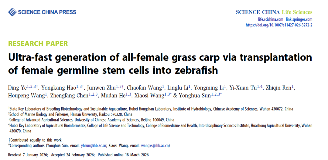 近日,中国科学院水生生物研究所孙永华团队在Science China Life Sciences(《中国科学:生命科学》英文版)在线发表题为“Ultra-fast generation of all-female grass carp via transplantation of female germline stem cells into zebrafish”的研究论文,他们利用性成熟周期仅为3个月的模式鱼斑马鱼为受体,在总计6个月内借腹生殖产生了草鱼的全X精子和全雌子代,与传统草鱼性控育种需要10年以上的时间相比,大幅提升了育种效率。文章将以封面文章正式出版。