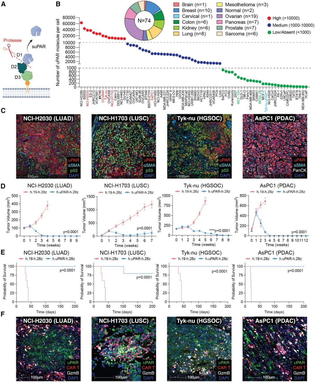 研究团队通过整合分析超过1万个肿瘤样本的数据发现,uPAR在多种携带TP53和RAS通路突变的实体瘤中广泛高表达,尤其是在卵巢癌、胰腺癌、结直肠癌、肺癌和脑癌的特定亚型中。