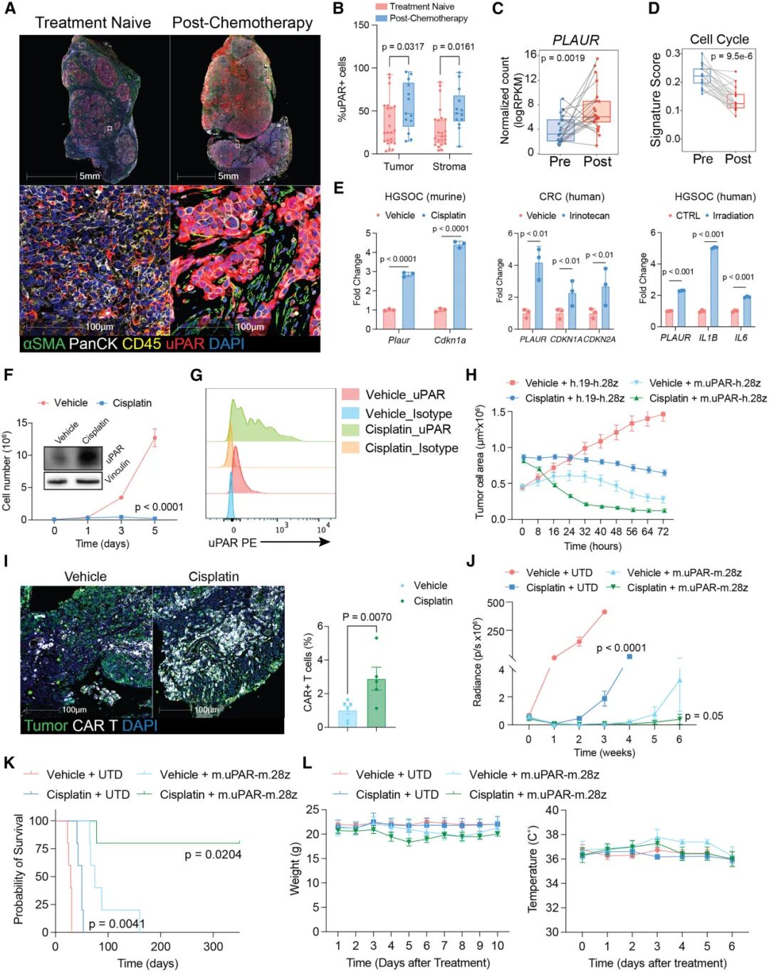 此外,研究还发现了一个潜在的联合治疗策略。许多化疗、放疗或靶向药物在杀伤肿瘤的同时,会诱导存活的肿瘤细胞进入一种“衰老样”状态,而这种状态会上调uPAR的表达。在卵巢癌和肺癌的小鼠模型中,先使用顺铂等诱导衰老的化疗药物预处理,可显著增加肿瘤细胞的uPAR抗原密度,从而大幅增强后续uPAR CAR-T细胞的疗效,实现“1+1>2”的协同抗肿瘤效果,且不增加额外毒性。