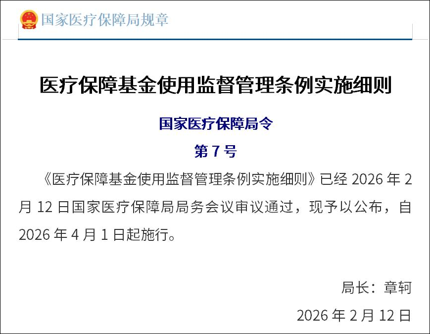 2026年2月12日,国家医保局局务会审议通过《医疗保障基金使用监督管理条例实施细则》(下简称《实施细则》),章轲局长签署国家医保局第7号令,公布《实施细则》,并定于2026年4月1日起正式施行。细则共5章46条,对医保基金使用、监督管理、法律责任作出全面细化。