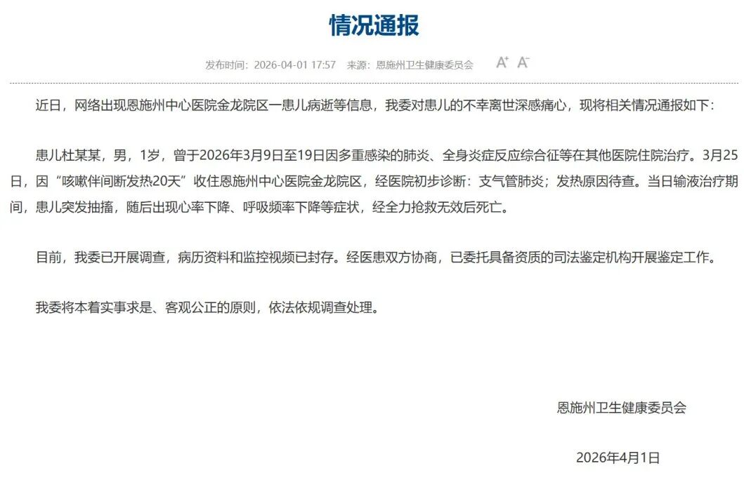 1岁男童输液后抽搐去世?湖北恩施州卫健委发布情况通报