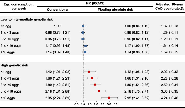 图4:鸡蛋消费和遗传风险与新发CAD的联合分析
