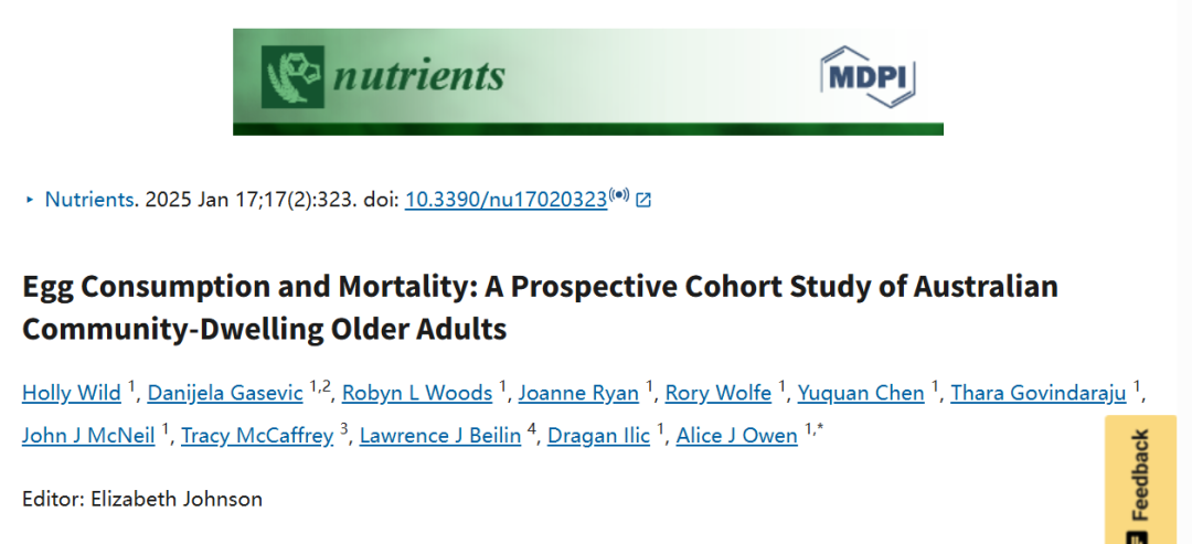 [1] Wild H, Gasevic D, Woods RL, et al. Egg Consumption and Mortality: A Prospective Cohort Study of Australian Community-Dwelling Older Adults. Nutrients. 2025;17(2):323. Published 2025 Jan 17. doi:10.3390/nu17020323