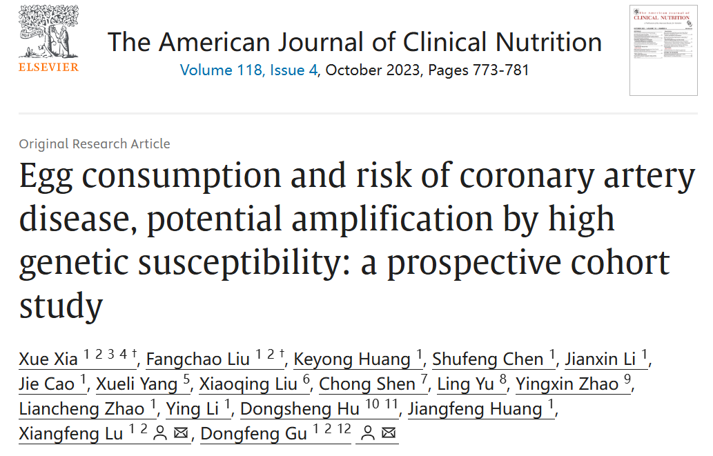[2] Xia X, Liu F, Huang K, et al. Egg consumption and risk of coronary artery disease, potential amplification by high genetic susceptibility: a prospective cohort study. Am J Clin Nutr. 2023;118(4):773-781. doi:10.1016/j.ajcnut.2023.06.009
