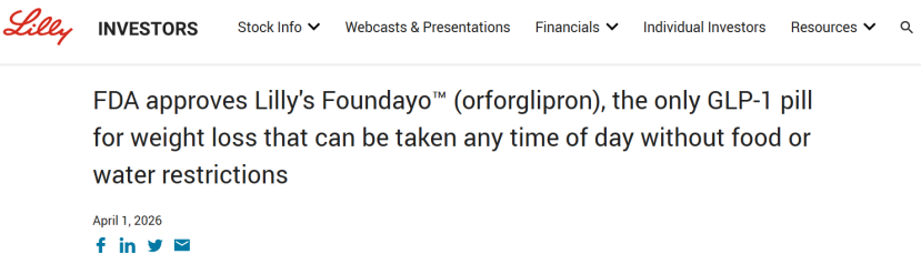 当地时间4月1日,礼来宣布,美国FDA已批准Foundayo(Orforglipron)上市,该药是全球首个获批上市的口服小分子GLP-1受体激动剂,也是FDA国家优先凭证(CNPV)试点计划下批准的首个新分子实体(NME),从递交申请到正式获批仅用了50天,打破了自2002年以来NME的最快审批纪录。