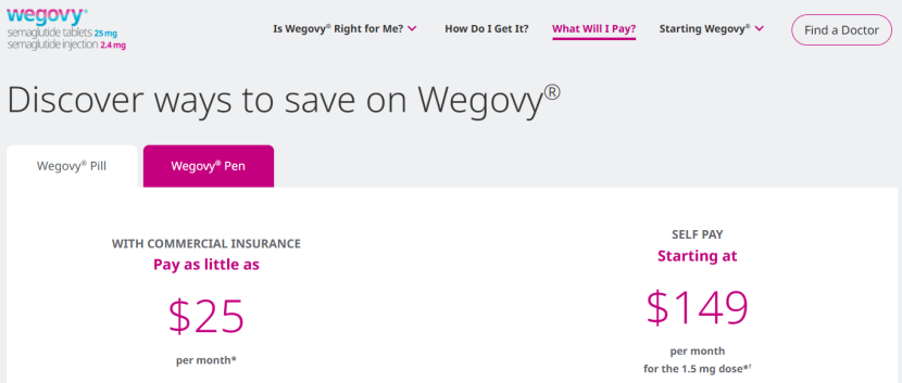 更值得关注的是双方在价格层面的正面交锋。礼来明确表示,对于有商业保险的患者,每月仅需支付25美元;而选择自费的患者,每月149美元即可使用该药的最低剂量。从两家的产品官网宣传来看,这一价格点与诺和诺德的Wegovy口服片剂价格完全一致——后者同样对商保患者25美元/月,自费患者的最低剂量149美元/月。
