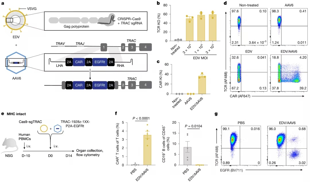 该研究开发了一种将腺相关病毒(AAV)与包膜递送载体(EDV)相结合的方法,用于在体内对人类原代 T 细胞进行定位特异性转基因整合。通过优化 AAV 和 EDV 工具,以提高细胞特异性递送效率并增强对人类中和抗体的抵抗力,研究人员能够在体内生成具有治疗水平的 TRAC-CAR T 细胞,并在多个人类化小鼠模型中控制肿瘤生长。