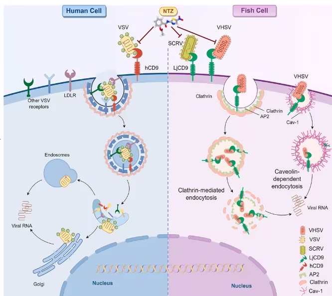 本研究报道了四跨膜蛋白CD9作为多种弹状病毒(包括VHSV(诺维弹状病毒属)、VSV(水疱性病毒属)和SCRV(鳜弹状病毒属))的保守功能性入侵受体。关键的是,作者鉴定出硝唑尼特(NTZ)——一种靶向G蛋白结构域IV的小分子抑制剂——能够有效抑制VHSV、SCRV和VSV的感染。该研究结果揭示了CD9是弹状病毒一个先前未被识别的跨物种入侵受体,从而为理解弹状病毒的致病机制提供了关键的机制性见解,并为广谱抗病毒治疗提供了一个潜在靶点。