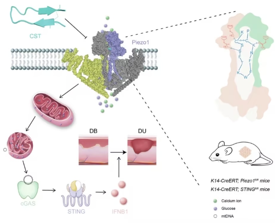 CST结合可减轻机械应力下的钙内流与葡萄糖积聚,在体外实验及糖尿病溃疡(DUs)模型中均表现出显著的保护作用。这些结果揭示了一条整合机械与代谢信号、驱动糖尿病中角质形成细胞功能障碍的CST-Piezo1-STING调控轴。