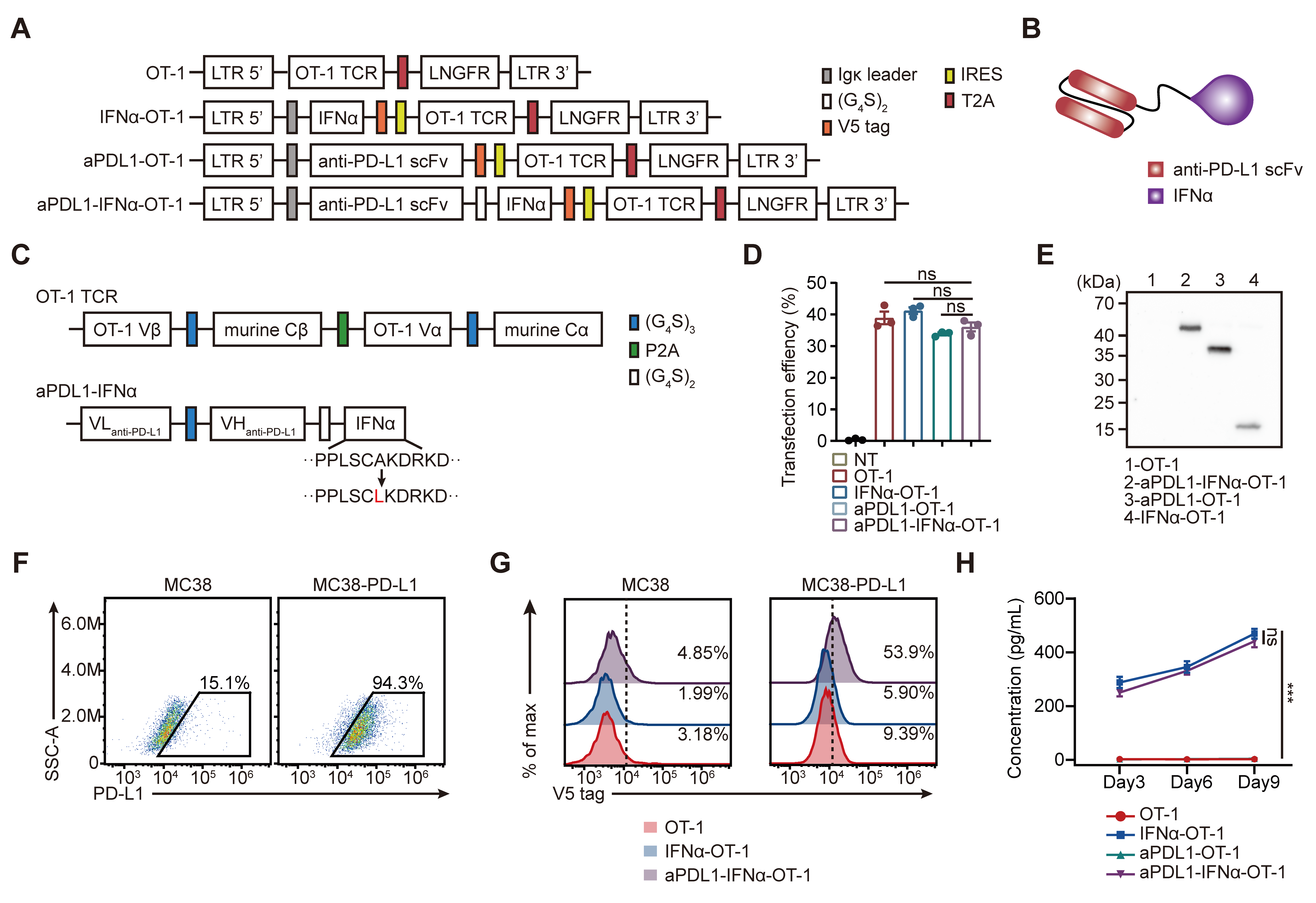 旨在增强IFNα对肿瘤的靶向特异性,同时阻断肿瘤细胞表面的PD-L1。设计了一种由IFNα与抗PD-L1抗体组成的双特异性融合蛋白,并利用TCR-T细胞作为“活体药物”实现靶向递送。首先,采用pMSGV1重组逆转录病毒载体构建并制备了可分泌该双特异性融合蛋白的TCR-T细胞(图2A和2B)。该IFNα/抗PD-L1融合蛋白由抗PD-L1 scFv与IFNα功能域构成;其中scFv包含VL与VH,二者通过一段(G4S)₃柔性连接肽相连,以保障整体结构稳定性。整个融合基因由LTR 3′端启动子驱动,上游配有Igκ信号肽序列,以促进蛋白向胞外分泌。为降低潜在不良反应,选用IFNα亚型α4,并引入突变A20L(图2C)。IFNα与抗PD-L1 scFv之间则由(G4S)₂柔性连接肽连接,以维持二者空间构象完整并确保各自功能独立发挥。为实现双特异性融合蛋白与OT-1 TCR的独立表达,在载体中引入了IRES。此外,还整合了GFP与V5标签,便于后续检测与功能验证。对照组包括:不分泌融合蛋白的OT-1 TCR-T细胞(OT-1)、仅分泌IFNα的TCR-T细胞(IFNα-OT-1)以及仅分泌抗PD-L1 scFv的TCR-T细胞(aPDL1-OT-1)。最终,将重组逆转录病毒颗粒进行包装,并转导至T细胞,从而获得可分泌相应蛋白的TCR-T细胞。