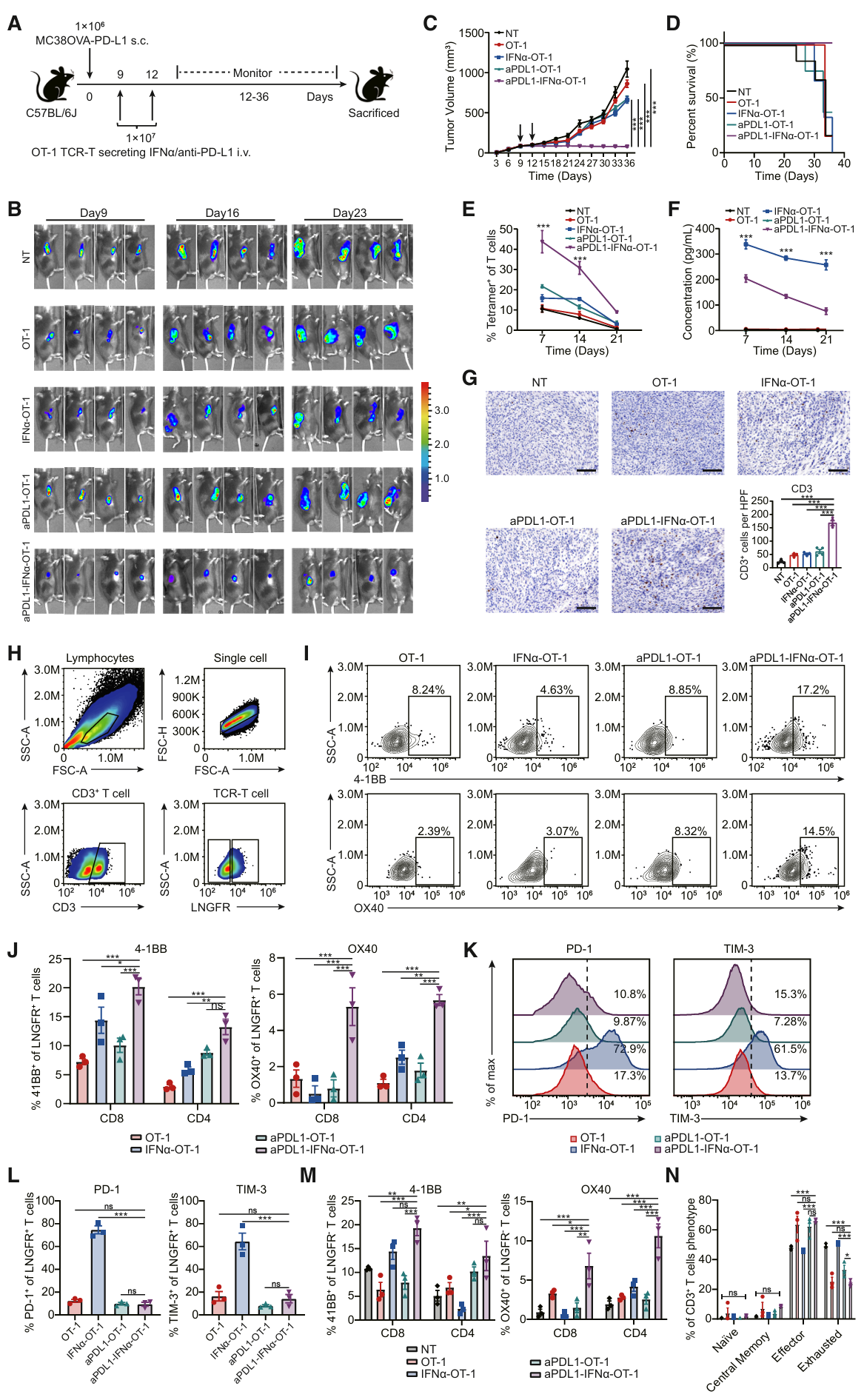 实验数据表明,携带不同构建序列的载体,其碱基长度的变化并未影响转导效率(图2D)。WB分析进一步证实,TCR-T细胞中融合蛋白在预期分子量处成功表达(图2E)。为评估融合蛋白的功能活性,利用重组逆转录病毒载体构建了PD-L1高表达的MC38肿瘤细胞系(命名为MC38-PD-L1)(图2F)。当MC38-PD-L1细胞与含融合蛋白的浓缩上清液共孵育时,IFNα/抗PD-L1特异性结合PD-L1(图2G)。还采用基于竞争性ELISA的免疫测定法估算了IFNα/抗PD-L1的产量。OT-1 TCR-T细胞未检测到含IFNα结构域的分泌蛋白,而aPD-L1-IFNα-TCR-T细胞上清液中则稳定检出IFNα/抗PD-L1,其总蛋白浓度随时间推移以约30pg/mL/天的速率持续上升(图2H)。综上,这些结果表明,TCR-T细胞所分泌的双特异性融合蛋白具备预期的结构完整性和功能活性。