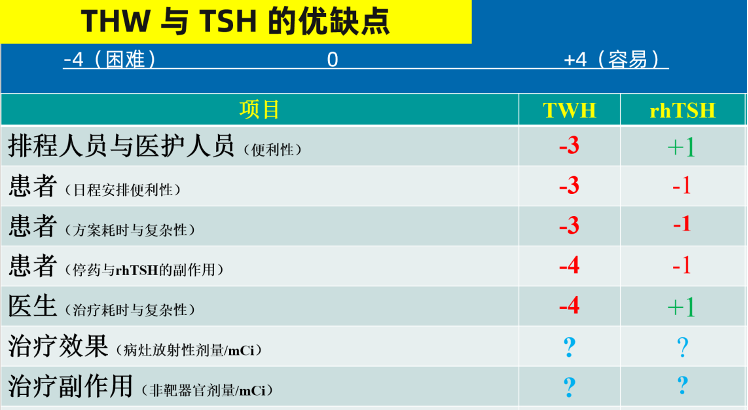 Douglas Van Nostrand教授指出,rhTSH是过去几十年来DTC领域最重要的进展之一,其临床适应证为:作为DTC患者(接受过甲状腺全切或近全切除术)随访期间的辅助用药,用于辅助进行血清Tg检测,可联合或不联合131I WBS检查。他通过设计评分量表(图5),直观对比了THW与rhTSH方案在多个维度的表现,凸显出rhTSH的显著优势: