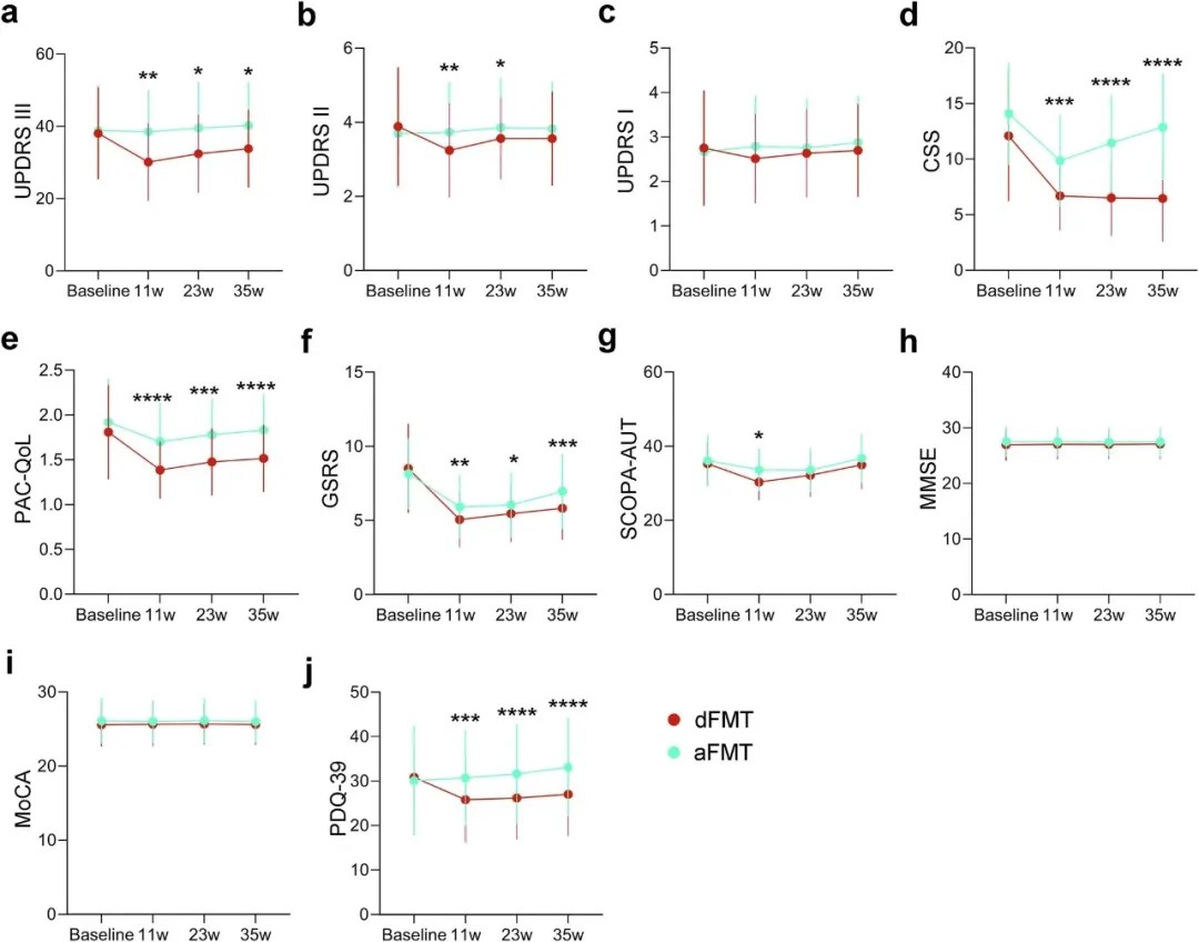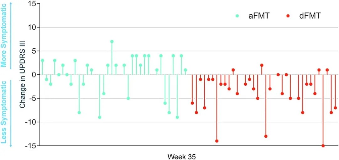 结果显示,与对照组相比,接受供体粪菌移植的患者运动症状得到显著改善。其运动评分平均降低了3.8分,而对照组几乎无变化。更重要的是,近半数(45.5%)接受治疗的患者达到了“有临床意义的改善”标准。