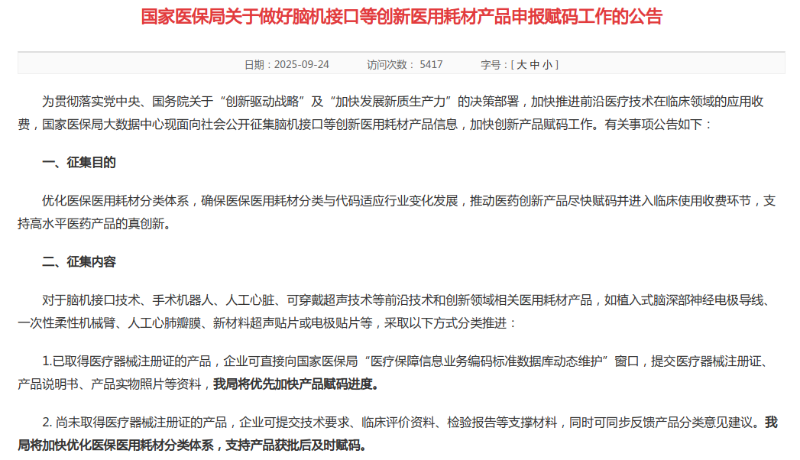 医保“码”力全开!全球首个脑机接口创新产品获得医保编码