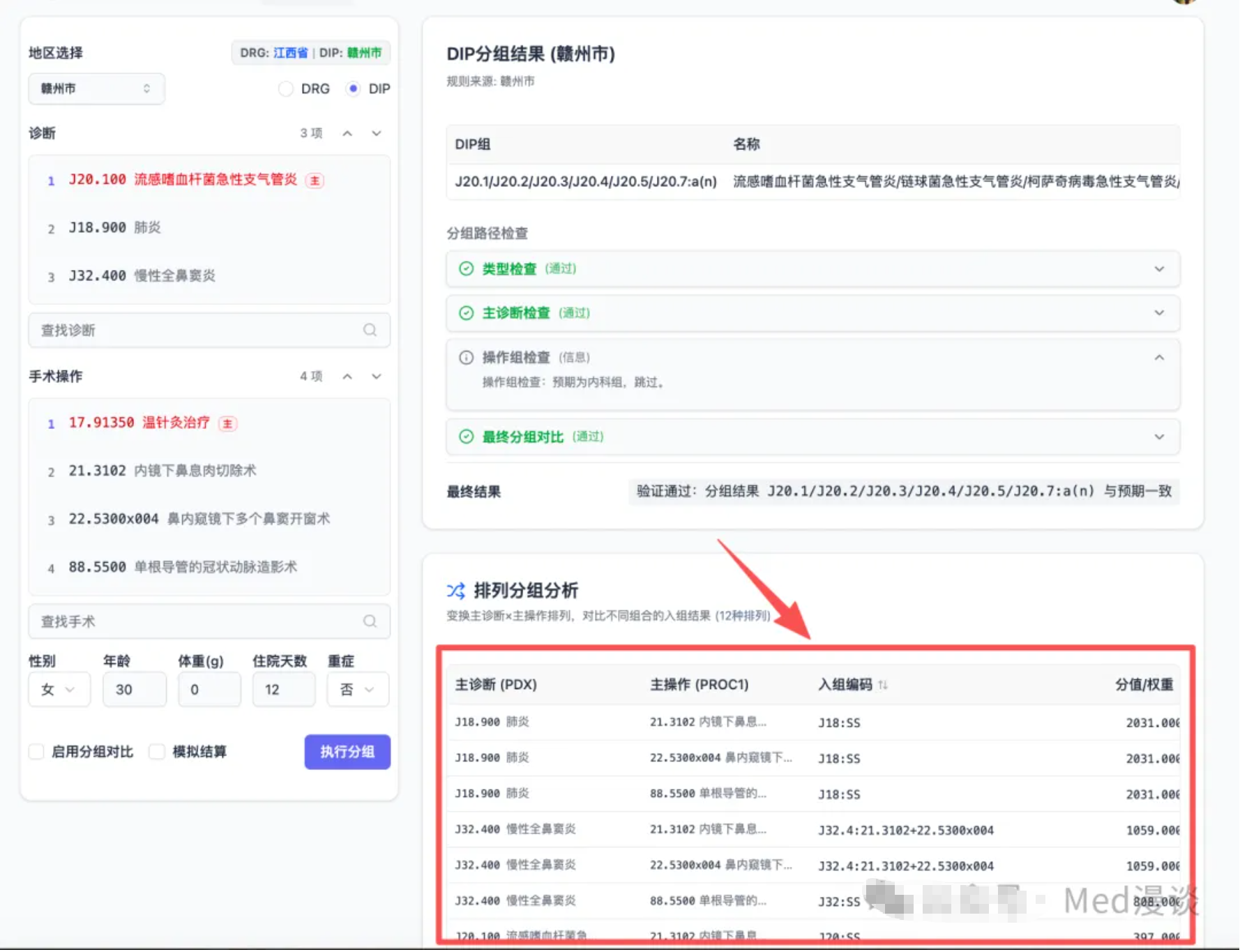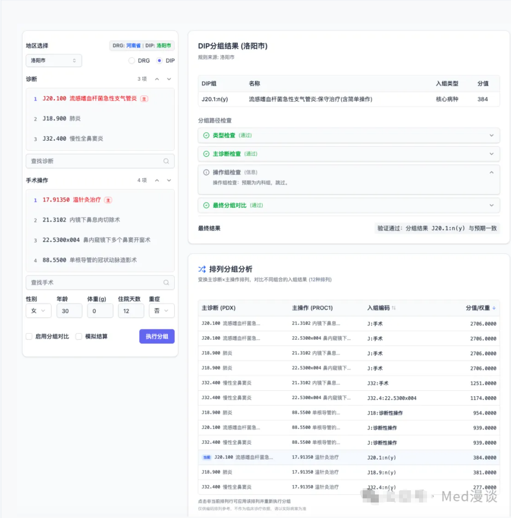 以下是三个城市的 DIP 入组实测截图,同一组病例在不同城市的分组结果和分值差异一目了然: