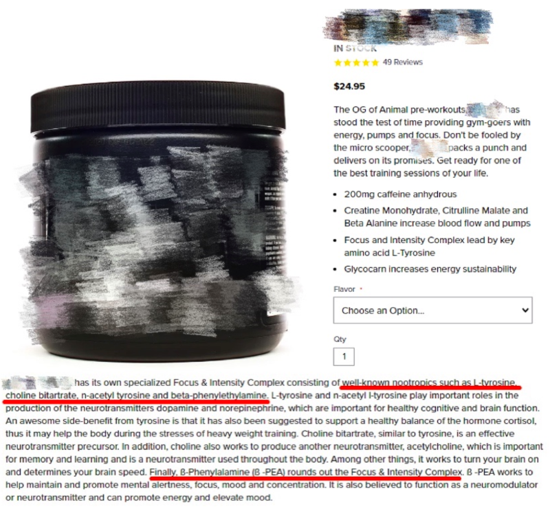 成分说明,在这种健身冲剂中,β-苯乙胺被描述为「有助于保持专注,保持良好心情,保持警觉性」。(图源:品牌官网)