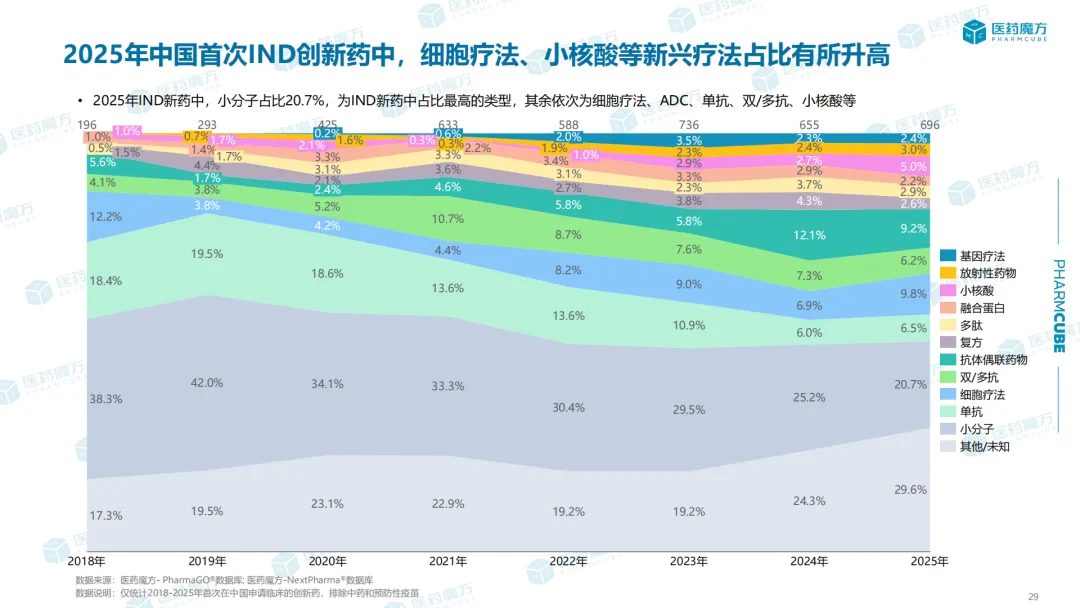 2025年在中国首次IND的创新药有696个,数量基本保持稳定,其中,国产药589个,占比85%,生物药占比逐步增至49.4%。按产品类型看,小分子的占比逐渐降低,2025年降至20.7%,细胞疗法、抗体偶联药物、小核酸等新兴疗法占比迅速提高。