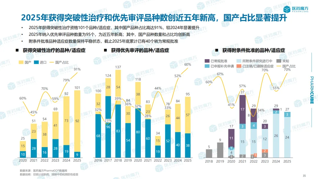 2025年获得突破性治疗和优先审评的品种/适应症数创近五年新高,其中国产占比显著提升。2025年有101个品种/适应症获得突破性治疗资格,其中国产品种占比高达91%,较2024年显著提升;2025年纳入优先审评的品种/适应症数量为95个,为近五年新高;附条件批准品种/适应症数量保持平稳状态。