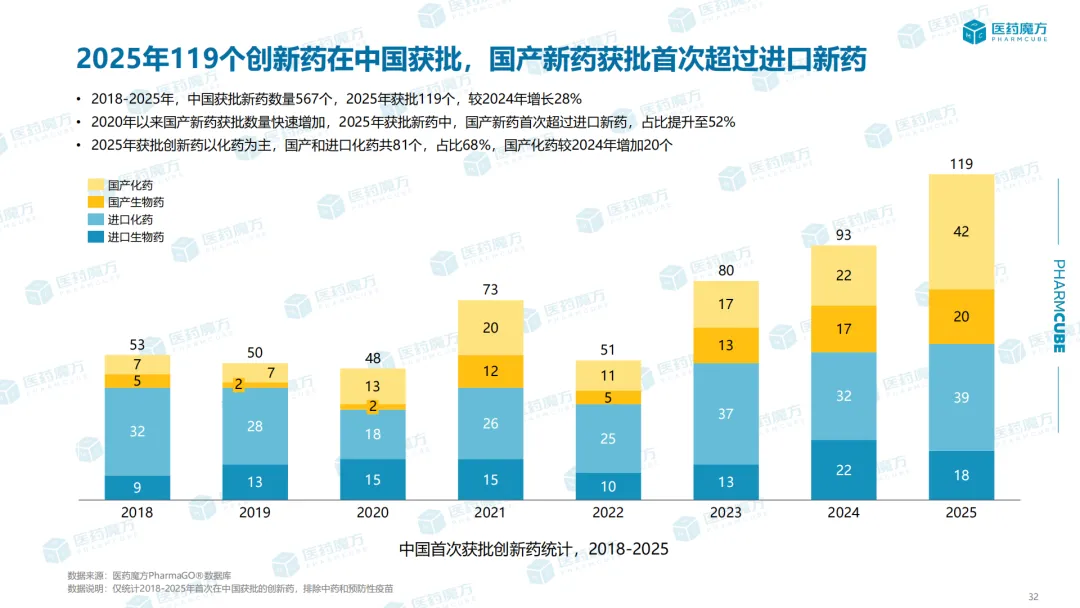 2018-2025年,中国获批新药数量567个。2025年获批119个,较2024年增长28%,是获批药品数量最多的一年。2020年以来国产新药获批数量快速增加,2025年获批新药中,国产新药首次超过进口新药,占比提升至52%,国产新药将逐渐占据主导地位。获批产品以小分子为主,2025年占比48.7%,此外,单抗(15.1%)、复方(10.9%)也是主要的获批类型,双抗、细胞疗法、小核酸、放射性药物等占比有小幅度提升。