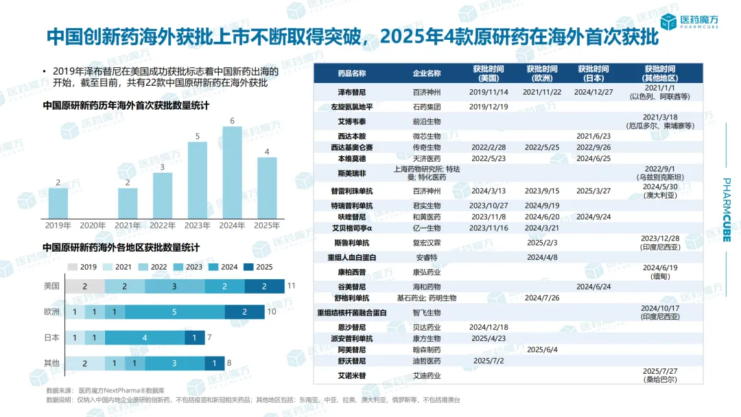 2019年泽布替尼在美国成功获批标志着中国新药出海的开始,随后中国创新药海外获批上市不断取得突破,截至目前,共有22款中国原研新药在海外获批,主要获批地区为美国和欧洲,2025年4款原研药在海外首次获批。