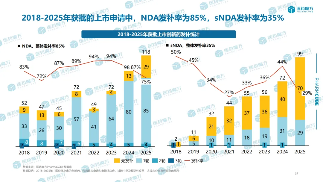 2018-2025年获批的上市申请中,NDA发补率为85%,2025年获批药品的发补率为75%,sNDA发补率为35%。从产品类型看,生物制品(89%)、国产品种(96%)NDA发补率相对更高。未经历发补的品种的中位审评时长约为8.6个月,1轮发补品种审评时长约为12个月。