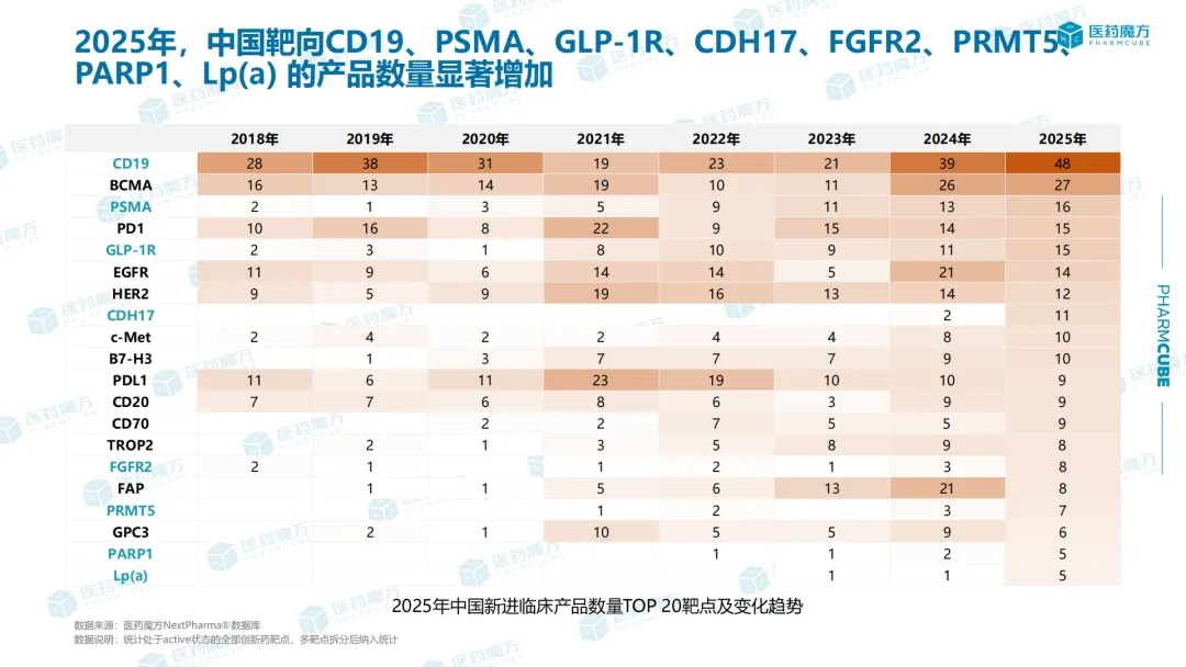 2018-2025年中国首次进入临床的原研创新药总计覆盖了843个靶点,TOP20靶点覆盖1028个产品,集中度为26.7%,显著高于全球(全球为18.2%),尤其是TROP2、CLDN18.2、GPRC5D等靶点,中国产品在全球占比超过70%。2025年,中国靶向CD19、PSMA、GLP-1R、CDH17、FGFR2、PRMT5、PARP1、Lp(a)