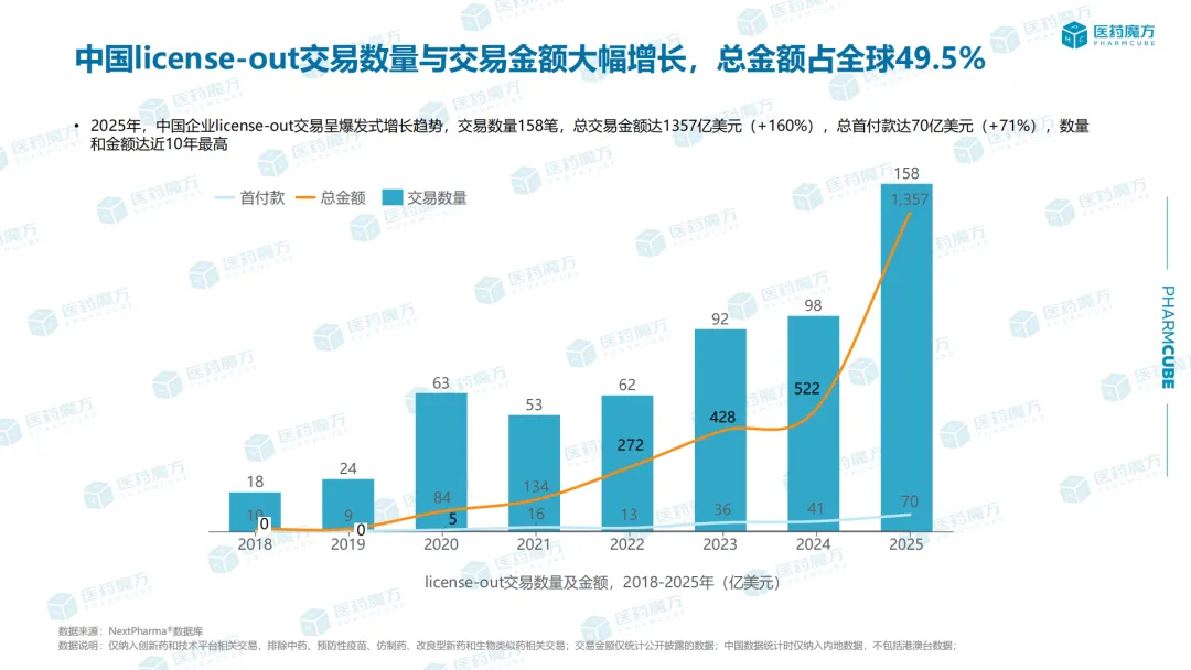 2025年,中国企业license-out交易呈爆发式增长,交易数量158笔,总交易金额达1357亿美元(+160%),总交易金额在全球交易中的占比已达49.5%,总首付款达70亿美元(+71%),数量和金额达近10年最高。